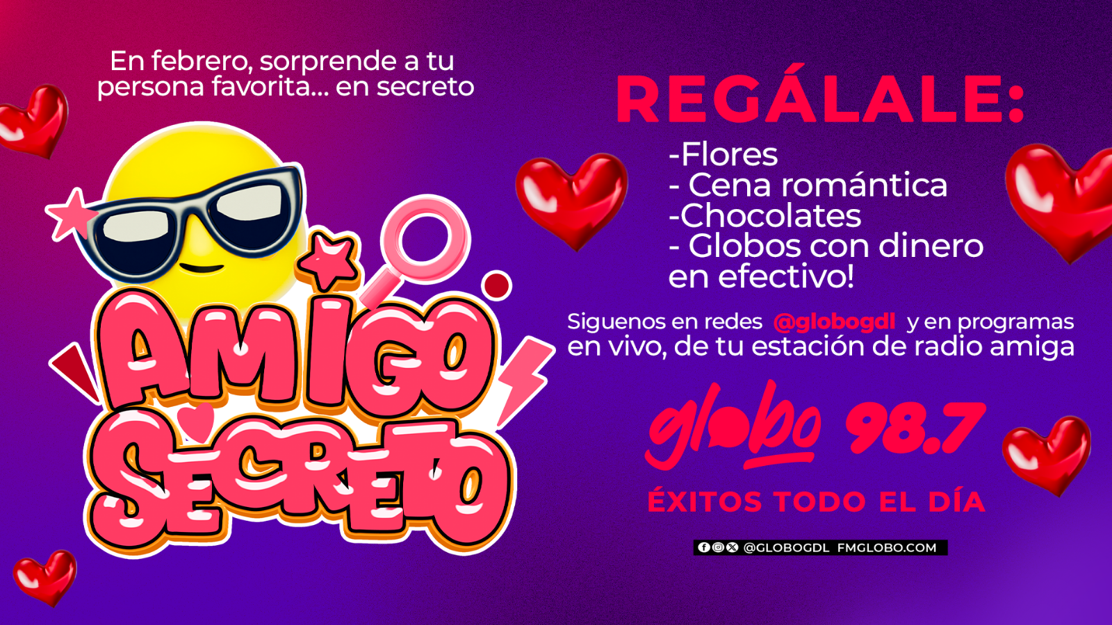 En Globo 98.7 es tiempo de celebrar el amor y la amistad. Conviértete, en la amiga o el amigo secreto para sorprender a tu persona favorita.