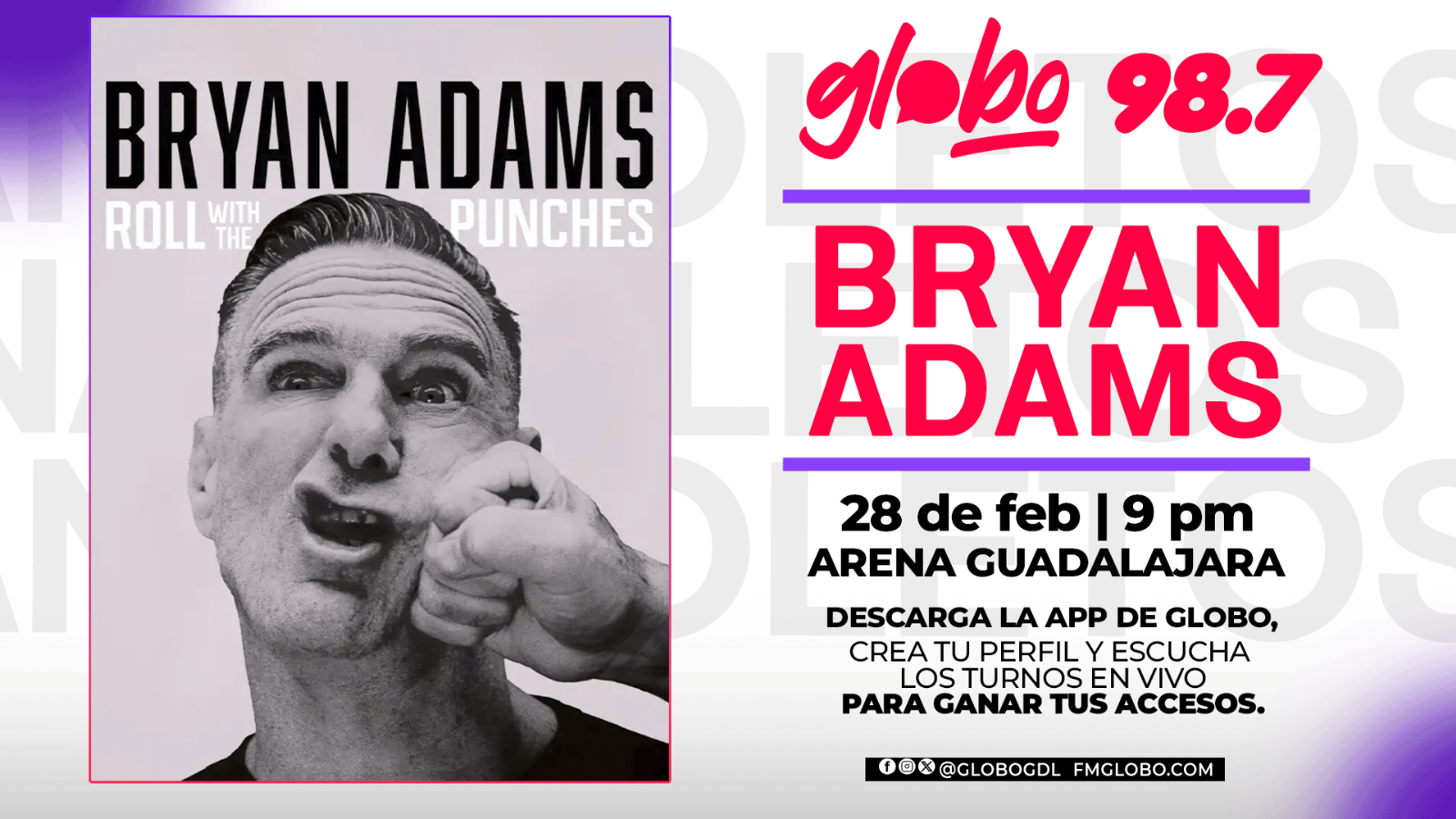 Obten tu acceso doble para vivir una noche de buen rock y letras poderosas con “Roll with the punches tour”. Siguenos en redes y programas en vivo de Globo… 98.7 Éxitos todo el día y los mejores conciertos… todo el año.