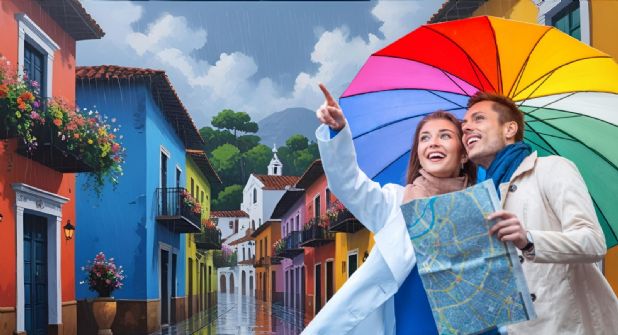 La ciudad está rodeada de montañas y vegetación, cobra vida con el brillo de la lluvia, resaltando su belleza natural y cultural.
