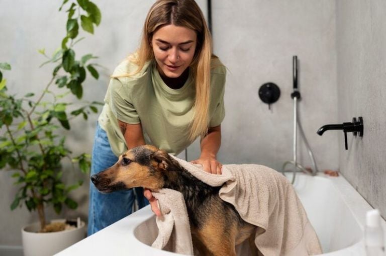 - Ten todo listo: Champú para perros, varias toallas absorbentes y un secador con aire tibio son esenciales para un baño seguro.
