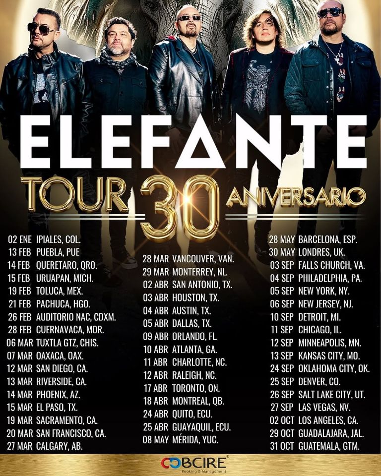La gira mundial de Elefante por sus 30 años inicia en el Auditorio Nacional de CDMX y se extenderá por un año y medio, visitando ciudades como Puebla, Toluca, Cuernavaca, San Diego, Phoenix, Vancouver, Calgary, Orlando, Atlanta, y regresando a Europa tras un exitoso paso por Londres, Milán, Madrid y Barcelona hace meses.