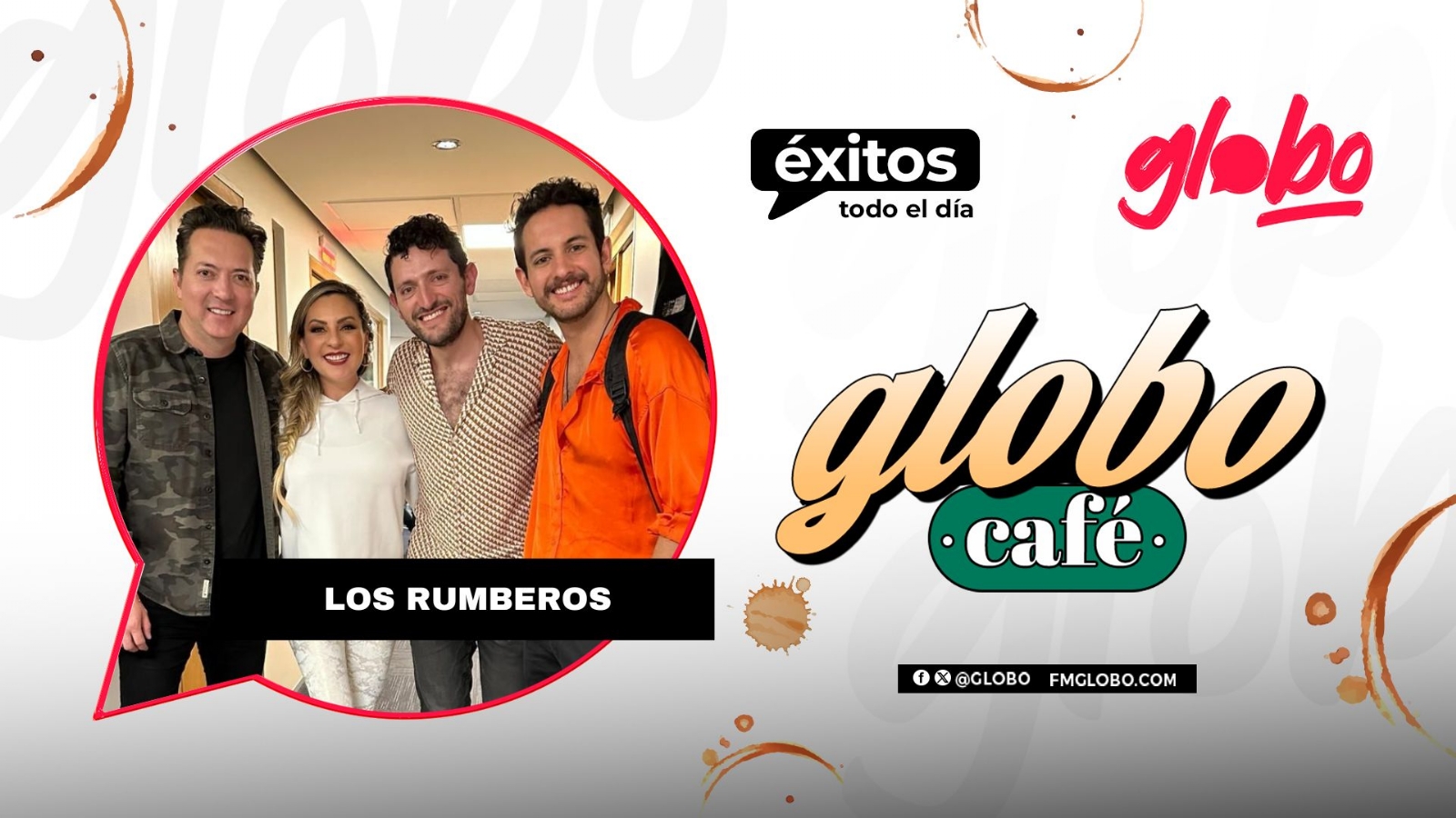 Los Rumberos estuvieron en la cabina de Globo Café, junto a Mariana y El Bazooka, donde nos contaron más acerca de su sonido fresco y contemporáneo.Los Rumberos nos estuvieron acompañando en nuestra cabina, donde platicaron acerca de sus nuevos lanzamientos, además de deleitarnos con algunas canciones en vivo como: "Chico Cursi" y "Ninguna".