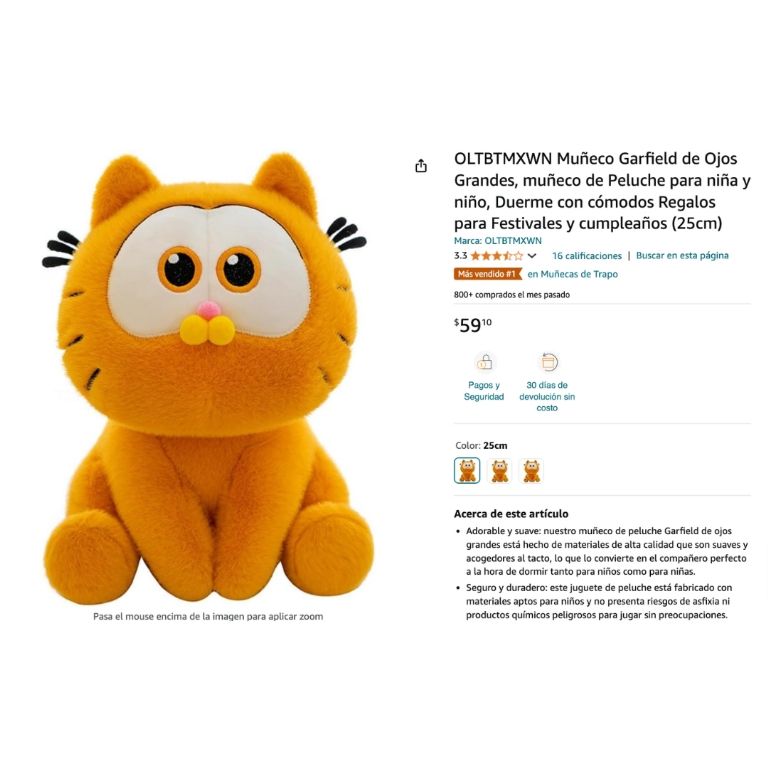 Este gran muñeco de peluche lo puedes conseguir a través de la pagina oficial de Amazon a tan solo $59 pesitos, lo mejor de todo es que su textura suavecita y el realismo que lo inunda hace que valga totalmente la pena, sobre todo si eres fanático del gatito glotón y te dedicas a coleccionar artículos que sean referentes a él.