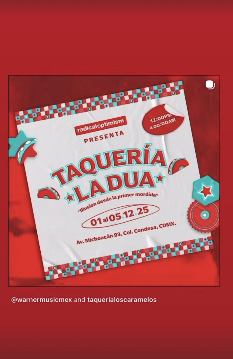 El menú estelar incluye tacos como “Houdini” (chicharrón crujiente), “Radical Optimism” (carne asada con toques dulces) y “Training Season” (opción veggie), por $249 MXN el combo “La Dua”. Todo inspirado en su álbum, con sabores de CDMX elevados a nivel pop.